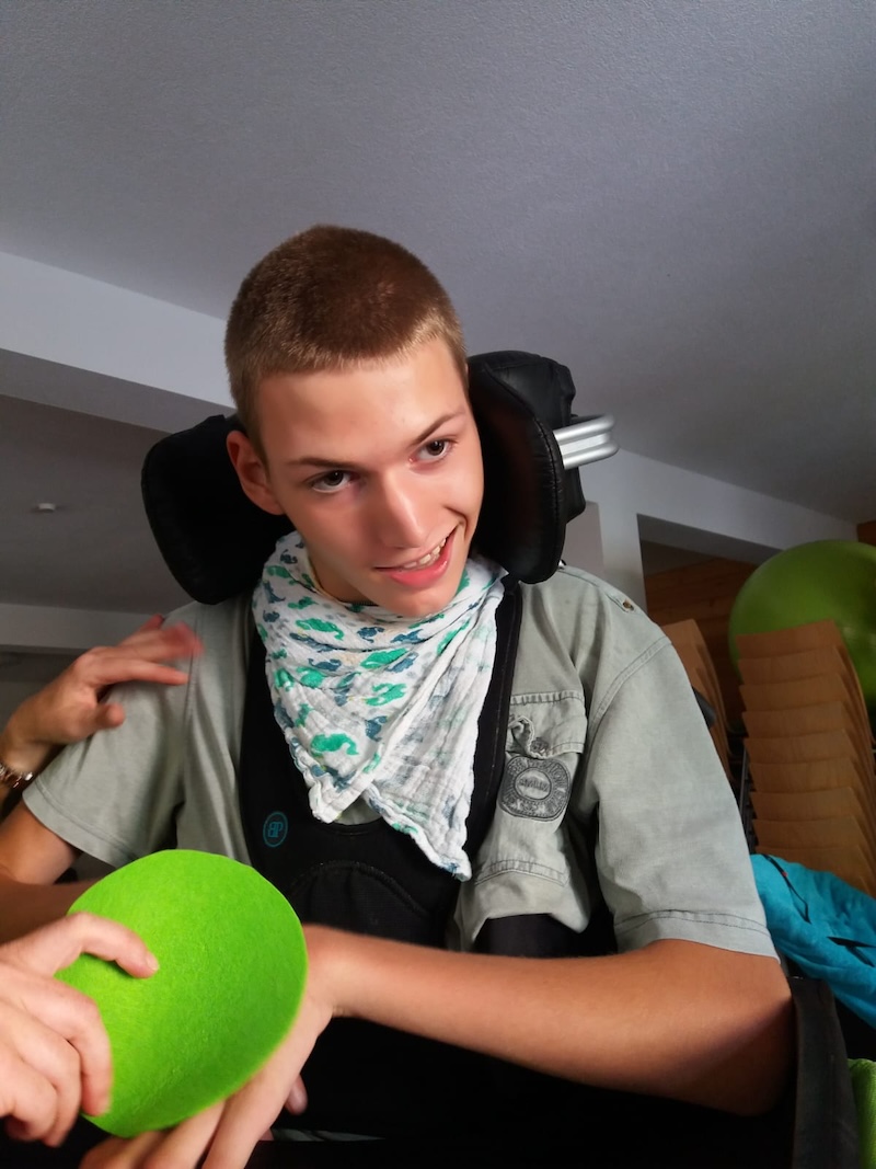 Er sitzt im Rollstuhl, spricht nicht, kann keine gezielten Bewegungen ausführen und lebt mit Epilepsie. Sein Entwicklungsstand entspricht dem eines Babys.